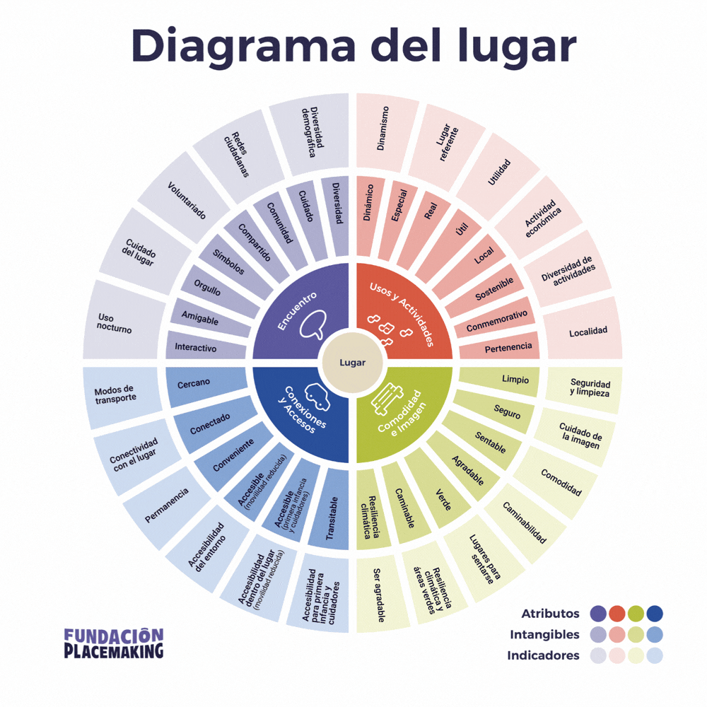 Los indicadores e intangibles se agrupan en 4 dimensiones principales: Encuentro, Conexiones y Accesos, Comodidad e Imagen, Usos y Actividades. Con eso obtienes el resumen final por atributo y el resultado global.